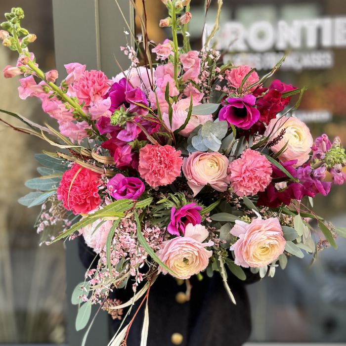 Un camaïeu de fleurs de saison dans les tons roses: renoncules, anémones, giroflées, mufliers, oeillets, genêt rose et grevillea pour célébrer l’amour dans toute son intensité.