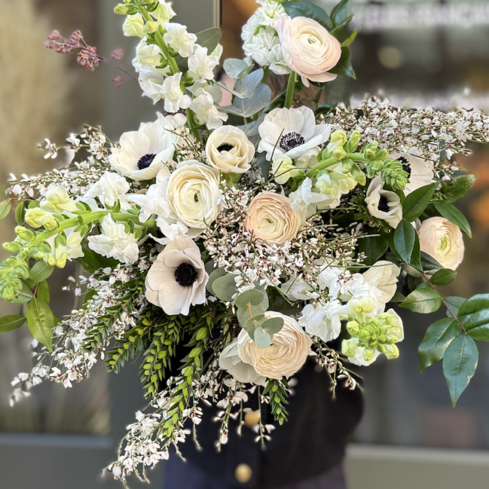 Renoncules Hanoi, anémones, giroflées, mufliers, genêt et eucalyptus composent une émotion feutrée, élégante et profondément sensible.
